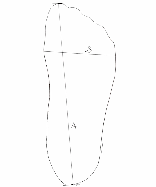 2. Stojąc na podłodze (nie na dywanie, ani innym miękkim podłożu) należy zgodnie z instrukcją ze zdjęć poniżej obrysować stopkę na około. Na odrysie należy zaznaczyć proste A i B i już mamy długość i szerokość stopy.