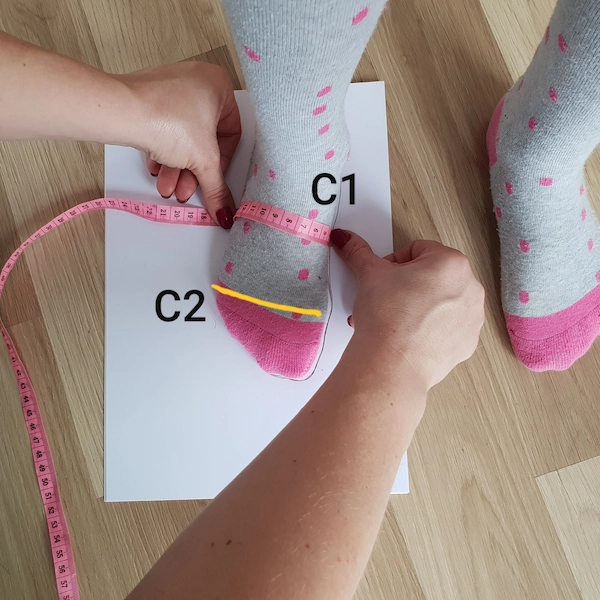 3. Podbicie mierzymy także na stojąco, NIE w powietrzu, bez odrywania stopy od podłogi. Jak widać na zdjęciu, wymiary C, C1 i C2 to łuki z wierzchu stopy, więc centymetrem krawieckim lub inną tasiemką lub sznurkiem należy zmierzyć z wierzchu stopy łuki od podłogi po jednej stronie stopy, do podłogi po drugiej stronie stojącej stopy, BEZ spodu stopy.
